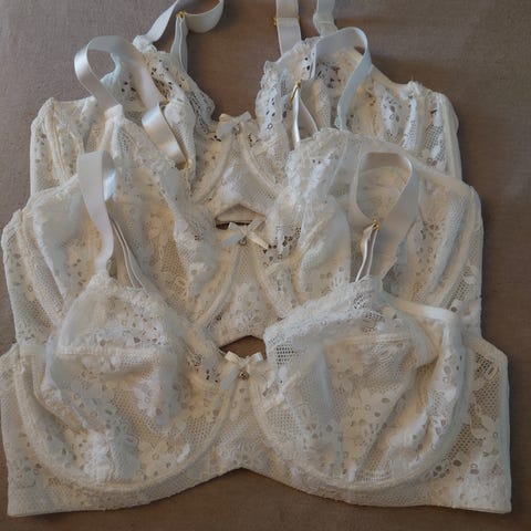 Det er en helt ny hvid Bh med bøjle og bløde blonder og inder skål. Str 100E. Stropperne kan stilles. Kun 40. Kr