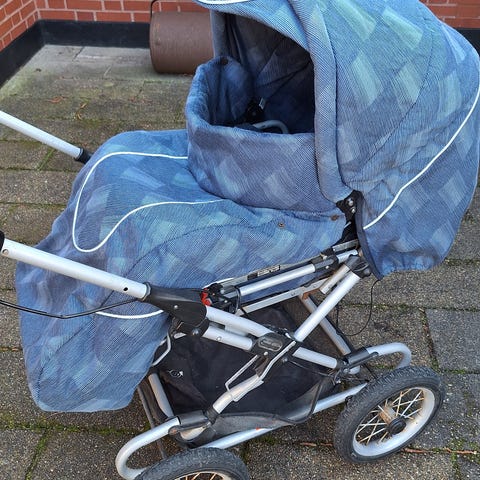 Emmaljunga klapvogn i sort med drejeligt forhjul og store baghjul. Har justerbart håndtag, kaleche og frontbøjle samt rummelig kurv under sædet.