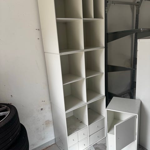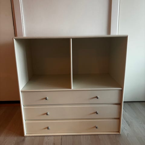 Hvis montana reol med 4 låger. Der er overfladiske brugstegn med sorte streger, men på toppladen er der farveforskel pga. sol og tidens tand. Bør omlakeres. Lågerne åbner og lukker perfekt.