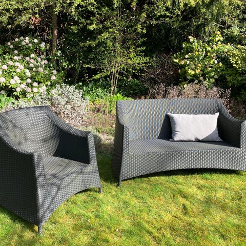 Lækkert havesæt i flet med sofa, to stole og rektangulært bord med glasplade. Lyse hynder på både sæder og ryg følger stilen og giver god siddekomfort.