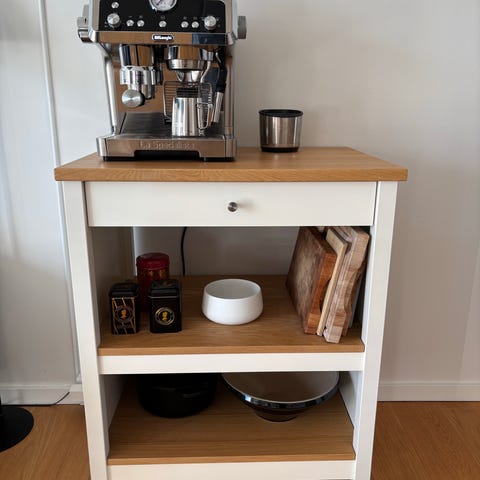 Møblet er velegnet som køkkenø, opbevaringsmøbel eller mindre køkkenreol.