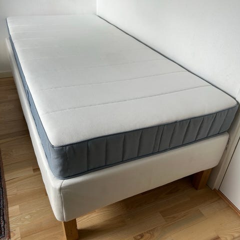Boxmadras inkl. topmadras fra Jysk med beige polstret ramme og træben. Hvid topmadras ovenpå for ekstra komfort. Knap to år gammel. Har tilhørt min teenagedatter der hellere ville have en dobbeltseng. Fin stand. Betrækket til topmadrassen kan lynes af og vaskes. Samlet nypris var 3650 kr.