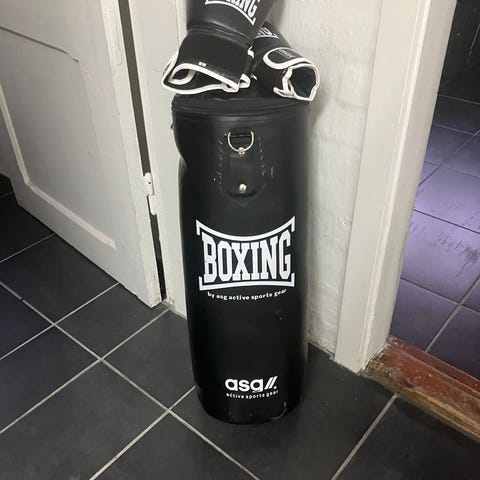 Boksepude i god kvalitet 110 cm høj, med kædeophæng. Ca 35-40kg. Enkelte afskalninger hist og pist - uden betydning. Kan muligvis også finde et par boksehandsker (til teenager).