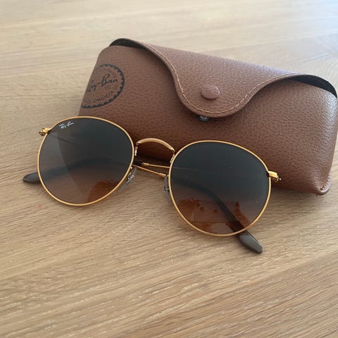Ray-Ban Round Metal solbriller med guldfarvet stel og mørkegrønne runde glas.