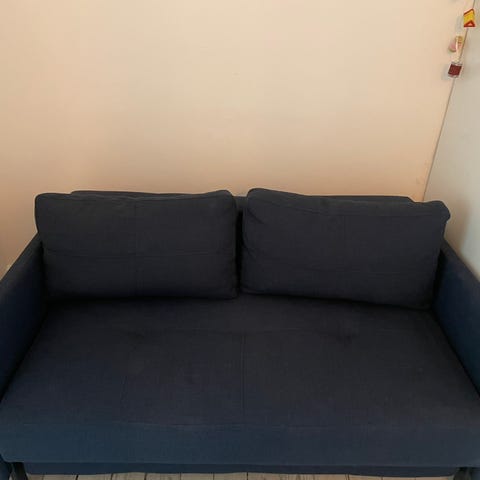 Sovesofa fra IKEA. Sengen har en almindelig madras med det betræk som ses på billedet. Der er tre puder og sengegavl. Madrassen er ca. 6 år gammel, men i god kvalitet fra en Stokke seng. Den følger med, men kan bare skiftes. Betrækket trænger til en vask.