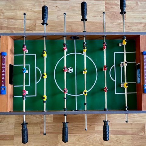 Stort bordfodbold bord med grøn bane, røde og sorte spillere og sorte håndtag. Har tællere i hver ende, syv bolde med til spillet og reservedele medfølger.