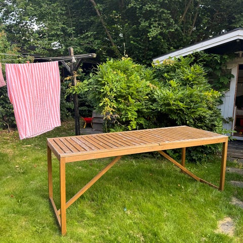 Ottekantet havebord i træ med lameller i bordpladen. Bordet står på krydsben og er nemt at flytte rundt på græsplænen. Har brug for maling. Målet er 120 x 120cm
