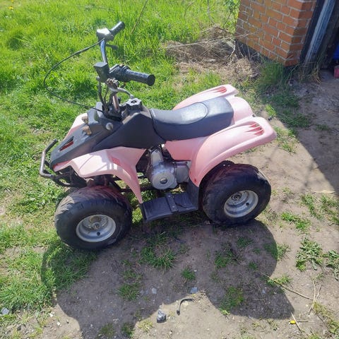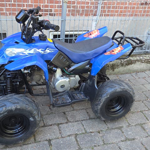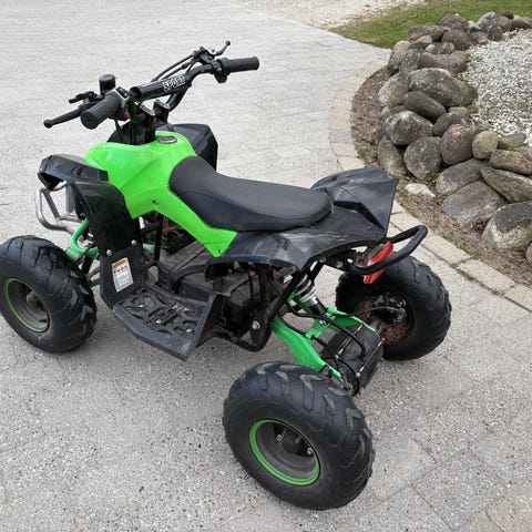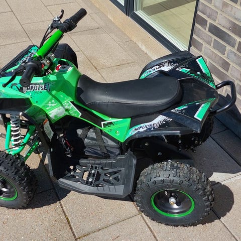 Lille ATV, men hurtig og op til 70kg. Fartbegrænser med nøgle. Nyt batteri i 2023 til 899,- Den har stået tørt og i isoleret og opvarmet skur. Fordækkene er slidte, der sælges reservedele via forhandleren. Horn og forlygte virker.