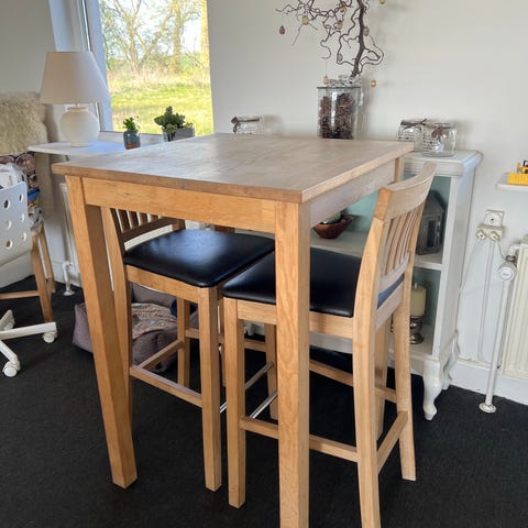 Brugt og med tydelige brugsspor (se billeder). Bordpladen trænger til en slibning/kærlig hånd – men til gengæld får du et massivt kvalitetsbord til en rigtig god pris, som kan blive super flot igen.