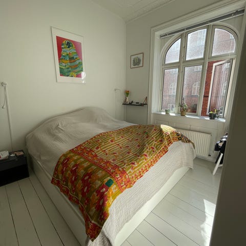 Boxmadras og lagen dertil medfølger. Topmadras medfølger også (kunne godt trænge til at blive skiftet ud).