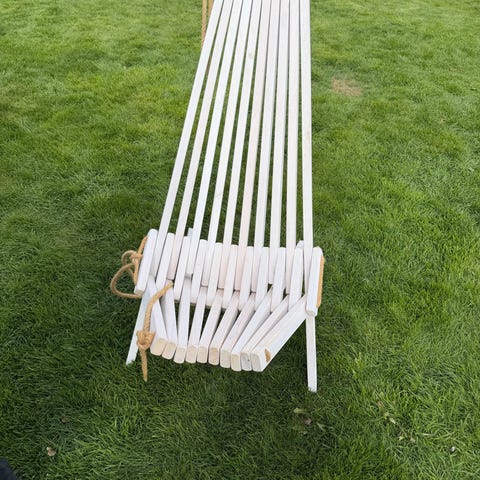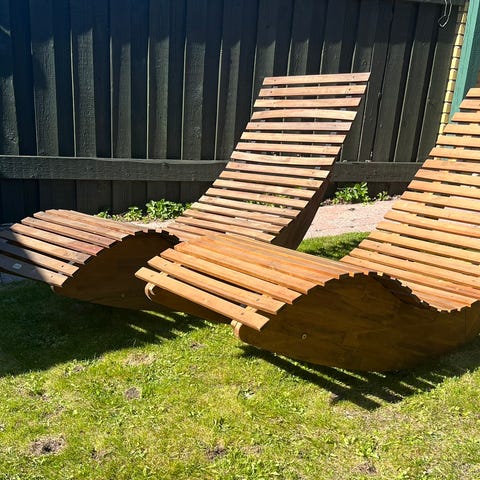 2 hvide træ solseng/liggestole med lameller og snore i enderne. Står på krydsben, så de er nem at stille op på terrassen eller i haven. Hentes samlet.