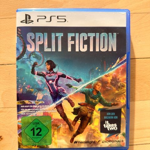 Playstation 5 spillet Split Fiction i original blå æske. PEGI 16 og med dansk/engelsk tekstinfo bagpå.