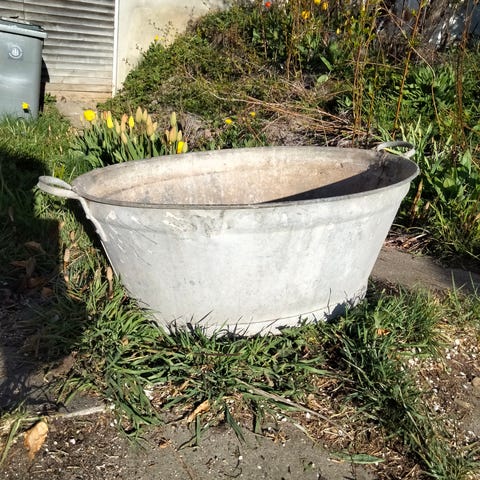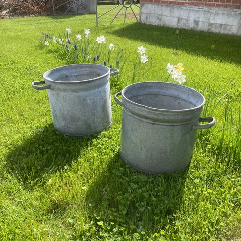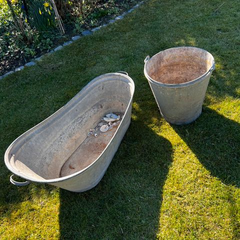 Zinkbalje og 2 spande - absolut utætte 😅, men hyggeligt til dekoration i haven.