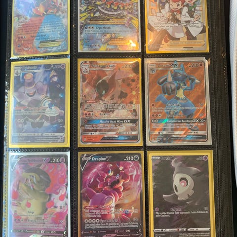 Samling af 9 Pokemon kort med GX og full art motiver, flere med flotte holo- og regnbueeffekter. Sælges samlet som på billedet til en Pokemon-samler der mangler lidt ekstra til mappen.