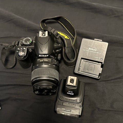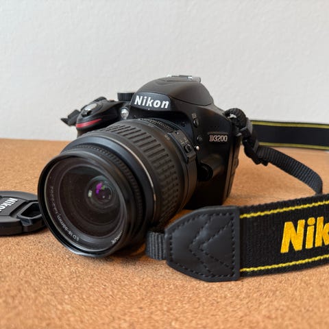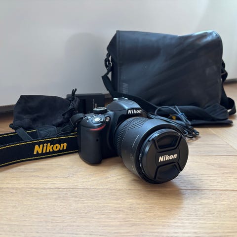 Nikon D3200 digitalkamera med 18-55mm objektiv og tilbehør.