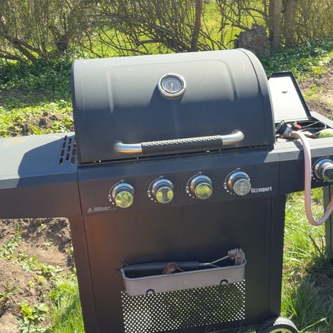 Outdoorchef gasgrill i sort med flere brændere og låg med indbygget termometer. Har sidebrænder med låg og skab under grillen til opbevaring.