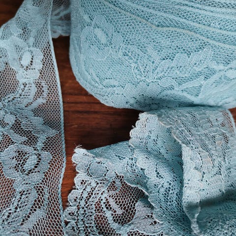 Bånd og blonder i lilla og turkis til syning og hobby