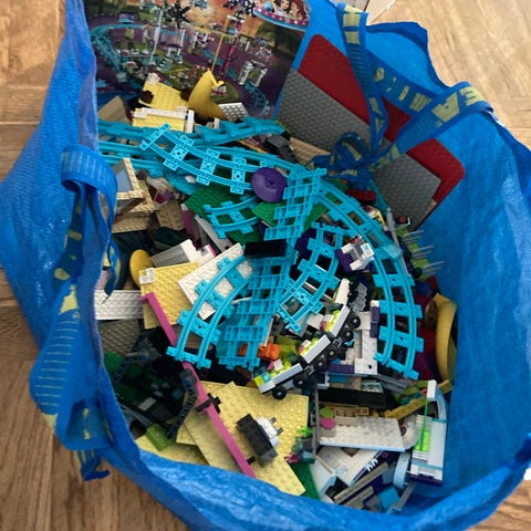 Stor blandet kasse LEGO Friends klodser med farvede skinner, plader og små dele. Der følger også røde togdele og grå togskinner med i blandingen.