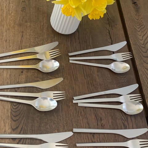 7 knive, 6 skeer, 6 gafler, 6 theskeer
