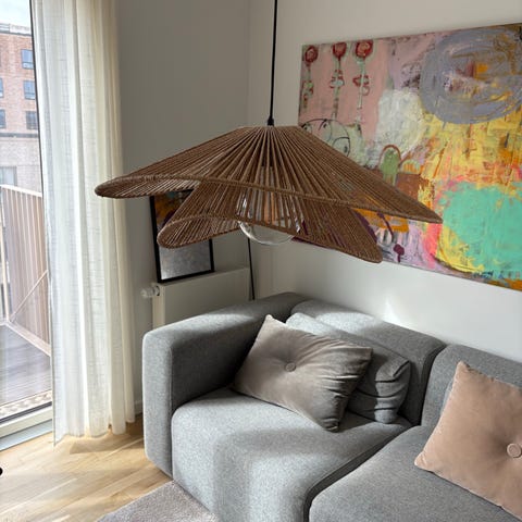 Regulerbart kabel måler 106 cm og lampeskærmen måler 62 cm fra den ene ende til den anden.