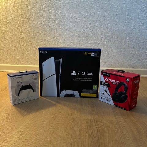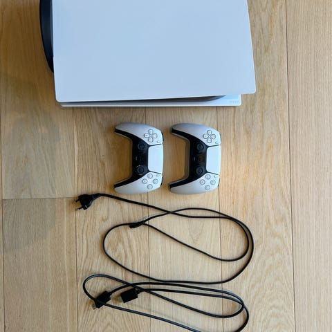 Playstation 5 sælges, har været brugt som almindelig spillekonsol. Med taske og to DualSense controllere i hvid og sort samt kabler, som på billederne.
