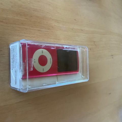 Lille Apple iPod Shuffle MP3-afspiller i gul med knapper på fronten. Har clip på bagsiden og tilslutning til kabel i bunden.