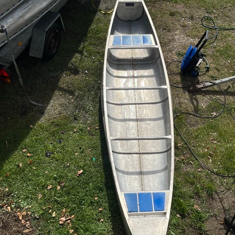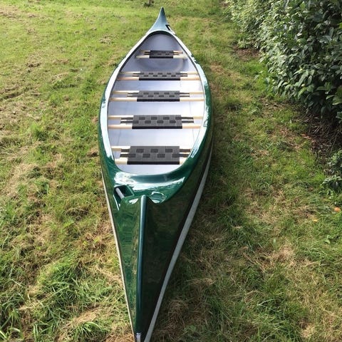 Grøn kano med flere faste sæder og sort belægning i bunden. Har håndtag i begge ender og god plads til ekstra oppakning.