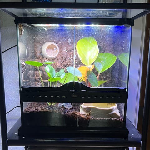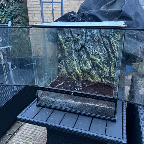 Flot terrarium med kunstige planter og træstub. Varme måtte sidder under og varmelampe samt pære medfølger.