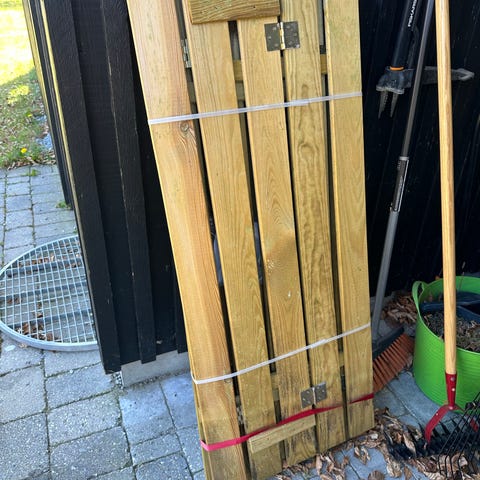 Træhegn/hegnselement sælges, lavet i trykimprægneret træ med vandrette lægter. Der følger også et bundt runde stolper med i samme stil.