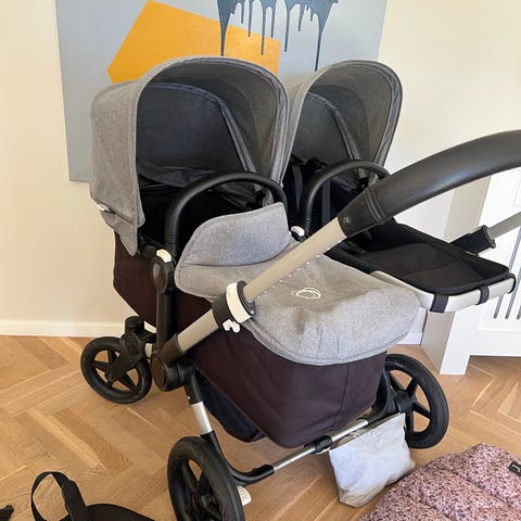 Utrolig flot, velholdt og “fornyet” søskendevogn. Der følger 2 klapvognssæder, 1 barnevognslift, 2 carry handles, 2 kalecher, 2 regnslag, sidekurv og donkey 3 varekurv med. Jeg har lige sat nye greb på hele vognen, så alle er pæne og intakte. Har punkterfrie hjul alt fungerer som det skal, virkelig lækker og nem vogn. Alt tekstil er taget af og vasket i neutralt, hjulene er taget af og renset for snavs og vognen er vasket ned, smurt og gjort klar til ny familie.