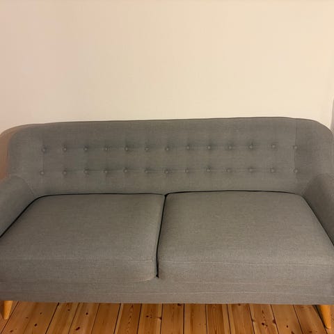 Er i tvivl om, hvorvidt denne sofa er beregnet to personer, eller burde blive listet som en 2 1/2’er. Uanset hvor mange mennesker, der kan sidde i den, er den i fin stand, selvom de lettere brugsspor på det nederste af dens fire ben vidner om år på bagen, ligesom også de to større plamager, som vi finder på den ene side af den ene horisontale hynde, må kategoriseres som værende slidtage. Bemærk i den forbindelse at det er muligt at tage betrækket af og udskifte det, skulle en potentiel ny ejer ønske det.