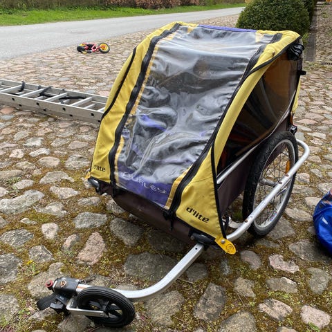 Burley D’Lite cykelanhænger til børn i rød/grå med plads til to, set med sele-system og net i siderne. Har stort gennemsigtigt frontcover, håndtag bagpå og reflekser på hjulene.