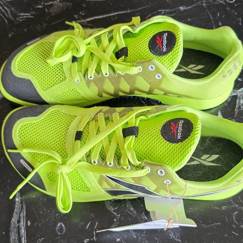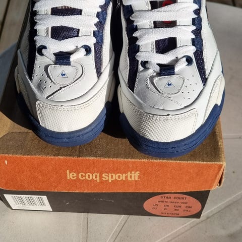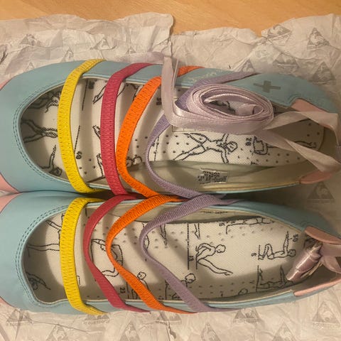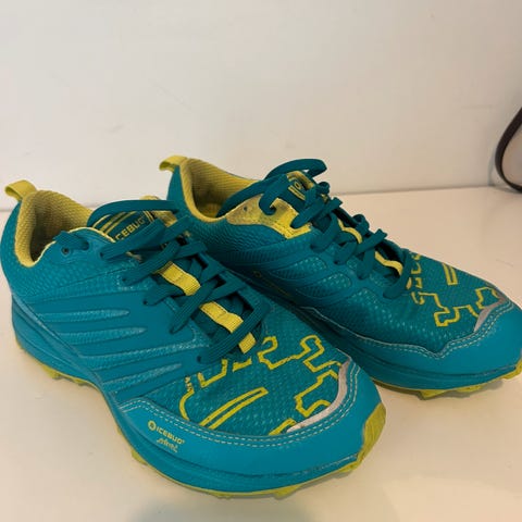 Sporty sko i lys blå farve med ruskindspåsætning. Gule snørebånd og flade rillede såler. Skoene er nye - en rest fra lukket butik.