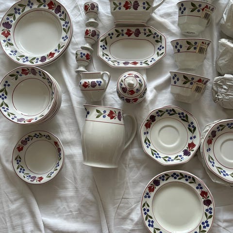 Adams Old Colonial porcelænsstel med farverigt blomstermønster langs kanten. Flere dele i samme stel, de fleste ubrugte. Det er købt hos Harrods i London og Skandinavisk Magasin i København.