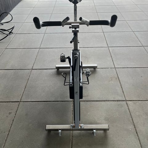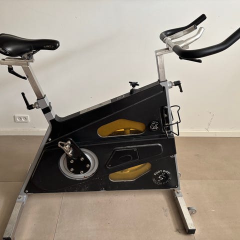 Body Bike spinningcykel i sort med justerbart styr og saddel. Har remtræk, nødbremse og pedaler med stropper.