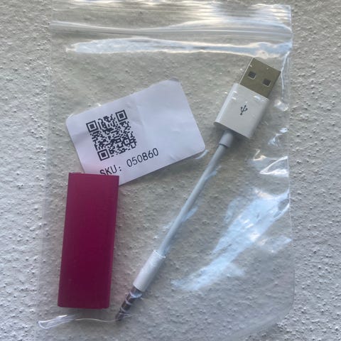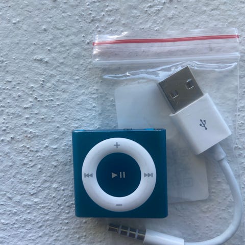 Lille Apple iPod Shuffle MP3-afspiller i sølvfarve. Med simpel clip på bagsiden og betjening på fronten, samt standard USB-kabel til opladning/overførsel.