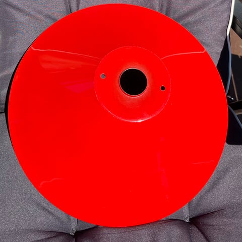 PH loftlampe fra Louis Poulsen i rød med hvid og blå inderside, designet af Poul Henningsen. Skærmene samles med små skruer, og der er hul til fatning i toppen.