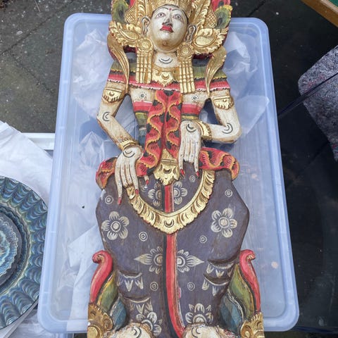 Flot udskåret træfigur med flere masker oven på hinanden. Der er en løkke bagpå, så den kan hænge på væggen.