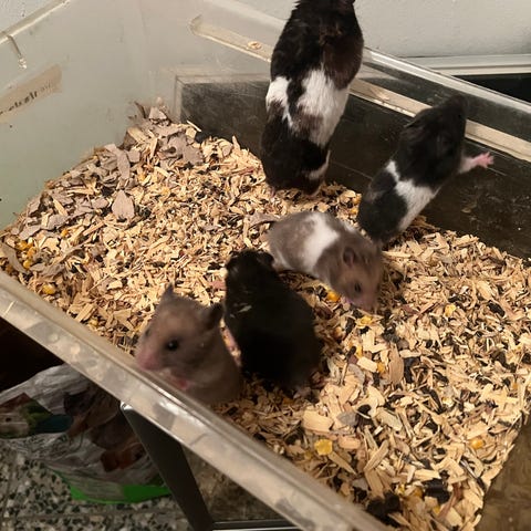 En guldhamster den er næsten helt ny har kun haft den i 4 dag alt kommer med mad og sand og bur vi købet alt for 1000kr men da min mor sagde vi skulle af med den hurtige. den er 2-3 uger gamle