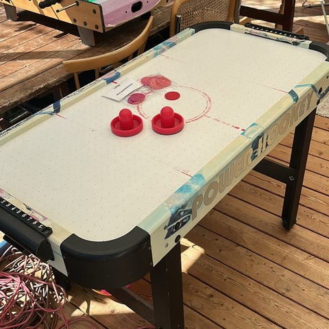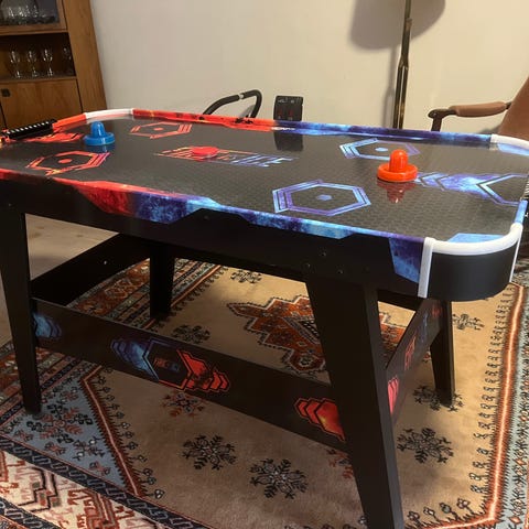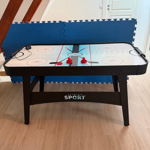 Fint airhockey bord fra Sport med hvid/blå spilleflade og sorte ben. Der er målmarkeringer på banen og det kører på strøm med blæser i siden.