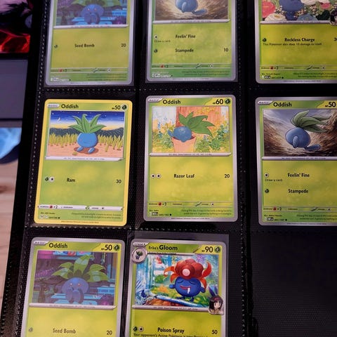 Samling af forskellige Pokemon Grass type kort, som ses på billederne. Flere forskellige generationer og motiver, samlet i lommer til ringbind.