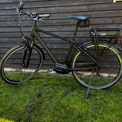 Batteri håndtag er knækket men lappet sammen med gaffatape som fungerer helt ude mærket. Cyklen er også monteret med maraton + dæk.