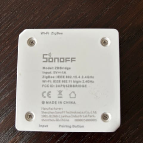 Sonoff RF Bridge 433 til at forbinde RF 433MHz enheder til dit WiFi-netværk. Har knap til pairing i bunden og tydelig mærkning af porte og specifikationer.