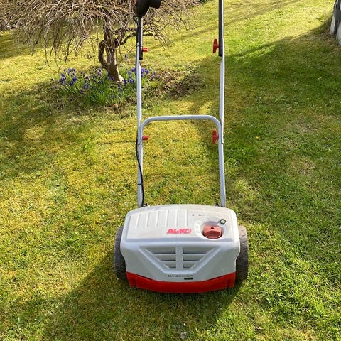 2 i 1 maskine. Vertikalskærer og mosfjerner. Har udskiftelig tromle med knive/fjedre og højde kan justeres med drejeknap på siden.