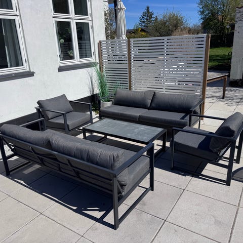 Fint loungesæt til terrassen med modulsofa. Sort flet med hvide hynder