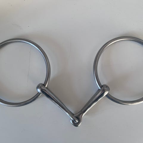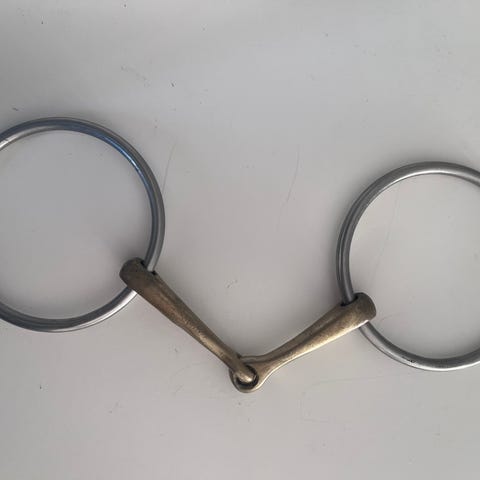 Sprenger Salox trensebid i 13,5 cm med løse ringe. Dobbeltleddet mundstykke i gylden metal og sølvfarvede ringe, se mål på billedet.