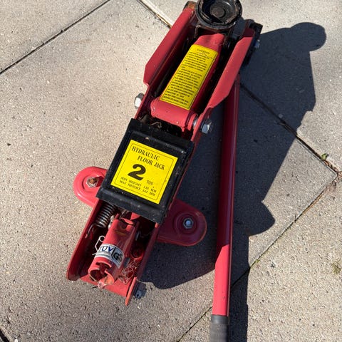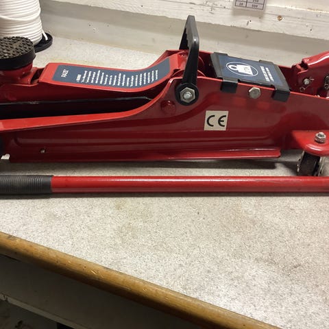 Bahco donkraft på 3 ton i orange og sort. Har langt håndtag, hjul og rundt løftehoved med gummiplade.