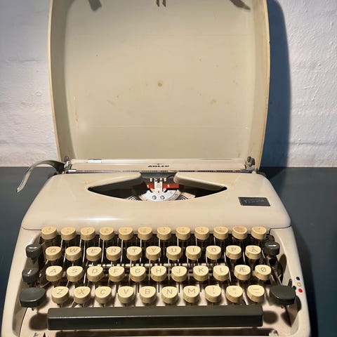 Willy Scheidegger mekanisk skrivemaskine i lys farve med sort tastatur. Står i hårdt plastkuffert med håndtag og har klassisk vogn, typearme og farvebåndsholder.
