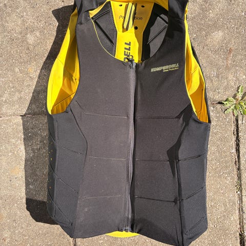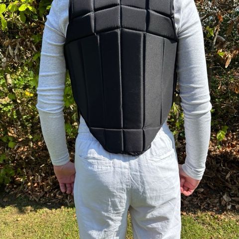 FLAXO rygskjold vest i str L i sort med lynlås foran. Har polstrede felter og mesh-paneler for åndbarhed samt ekstra beskyttelse over ryggen.