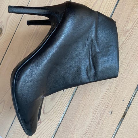 Sorte knæhøje dame støvler med en kombination af mat sort på den ene side og “krokodille” mønster på den anden side. Støvlerne er størrelse 39 og kan afhentes på Frederiksberg 2000. Brugt få gange og kun med små synlige brugsspor.